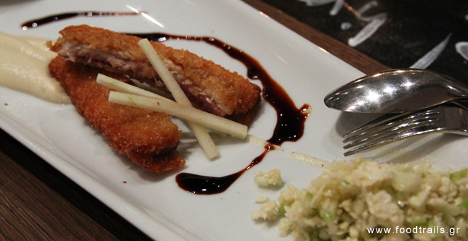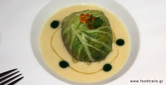 Μαζί με μία ανάμεικτη σαλάτα με βινεγκρέτ λιαστής ντομάτας με παλαιωμένη γραβιέρα, έκαναν πασαρέλα τα πρώτα πιάτα: μπιφτεκάκια σφυρίδας με bbq sauce, λουκάνικο γαρίδας σε σάλτσα μουστάρδας και κρεμμύδι κονφί, ντολμάς καραβίδας με λάχανο savoy και βελουτέ πράσου, χέλι μαριναρισμένο σε σόγια με ταρτάρ από κουνουπίδι και μήλο και, τέλος, Vitello Tonato με κάππαρη και τόνο.
