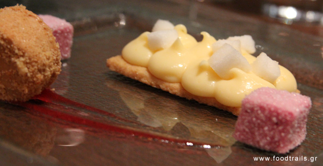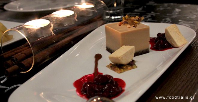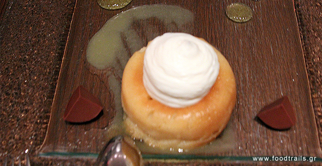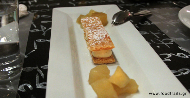 Το δείπνο μας έκλεισε γλυκά με καραμελωμένη λευκή σοκολάτα με νουγκατίνη φυστίκι Αιγίνης που μας ενθουσίασε, μπαμπά με μους καρύδας, τάρτα λεμονιού και μιλφέιγ με καραμελωμένα μήλα. Πληρώσαμε περίπου 50 € το άτομο μαζί με το κρασί.